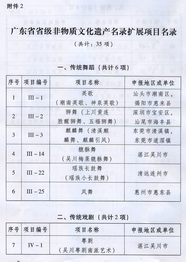 ? 附件1:廣東省第四批省級非物質(zhì)文化遺產(chǎn)名錄 附件2:廣東省省級非物質(zhì)文化遺產(chǎn)名錄擴展項目名錄 ? 廣東省人民政府 二○一二年二月二十一日 ?