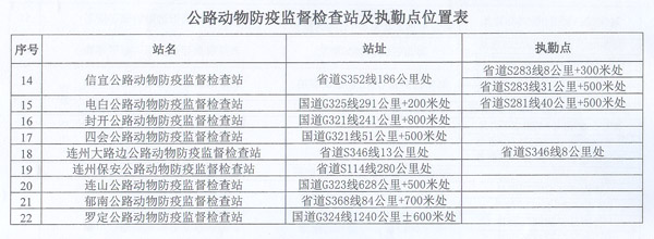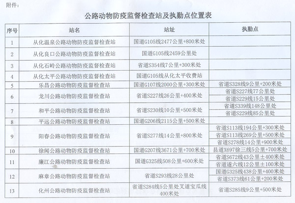 ? 廣東省人民政府辦公廳關(guān)于同意延長(zhǎng) 從化溫泉等22個(gè)公路動(dòng)物防疫 監(jiān)督檢查站設(shè)站時(shí)間的復(fù)函 ? 廣州、韶關(guān)、河源、梅州、陽(yáng)江、湛江、茂名、肇慶、清遠(yuǎn)、云浮市人民政府,省農(nóng)業(yè)廳: 穗府報(bào)〔2012〕129號(hào)、韶府請(qǐng)〔2012〕26號(hào)、河府〔2012〕54號(hào)、梅市府報(bào)〔2012〕45號(hào)、陽(yáng)府〔2012〕47號(hào)、湛府〔2012〕50號(hào)、茂府〔2012〕52號(hào)、肇府報(bào)〔2012〕33號(hào)、清府〔2012〕51號(hào)、云府〔2012〕60號(hào)文收悉。省人民政府同意延長(zhǎng)從化溫泉、從化良口、從化石嶺、從化太平、樂(lè)昌、龍川、和平、平遠(yuǎn)、陽(yáng)春、徐聞、廉江、麻章、化州、信宜、電白、封開(kāi)、四會(huì)、連州大路邊、連州保安、連山、郁南、羅定公路動(dòng)物防疫監(jiān)督檢查站的設(shè)站時(shí)間。上述各檢查站、執(zhí)勤點(diǎn)的設(shè)站(點(diǎn))期限均至2014年9月30日24時(shí)止。檢查站與執(zhí)勤點(diǎn)不得同時(shí)上崗執(zhí)法,執(zhí)法人員不得超越檢查站或執(zhí)勤點(diǎn)進(jìn)行流動(dòng)檢查。請(qǐng)切實(shí)做好監(jiān)督管理工作,確保依法檢查、文明執(zhí)法,嚴(yán)防公路“三亂”行為發(fā)生。 ? 附件:公路動(dòng)物防疫監(jiān)督檢查站及執(zhí)勤點(diǎn)位置表 ? ? ? ? 省府辦公廳 2012年9月26日 ? ?